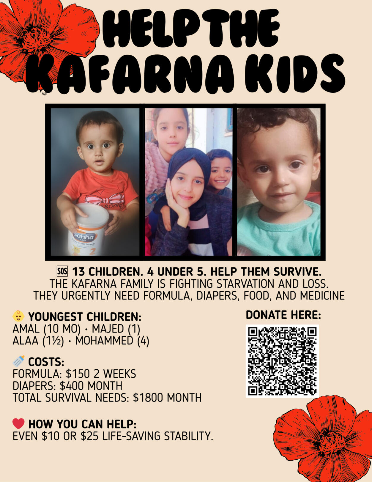 (including commission and transfer fees)The youngest and most at risk are:Alaa (1½ years)Majed (1 year)Mohammed (4 years)Amal (8 months)They are part of a family of 13 children, ages 8 months to 15 years:Rama (15), Ryad (14), Tala (10), Samer (10), Amir (10), Ezz (10), Hamsa (8), Mohammed (7), Mohammed (6), Mohammed (4), Alaa (1½), Majed (1), and Amal (8 months)These children are enduring forced starvation and unimaginable loss.Your donation — no matter how small — directly provides life-saving essentials like formula, diapers, and basic food. It truly makes a difference.Please, if you can, donate today.